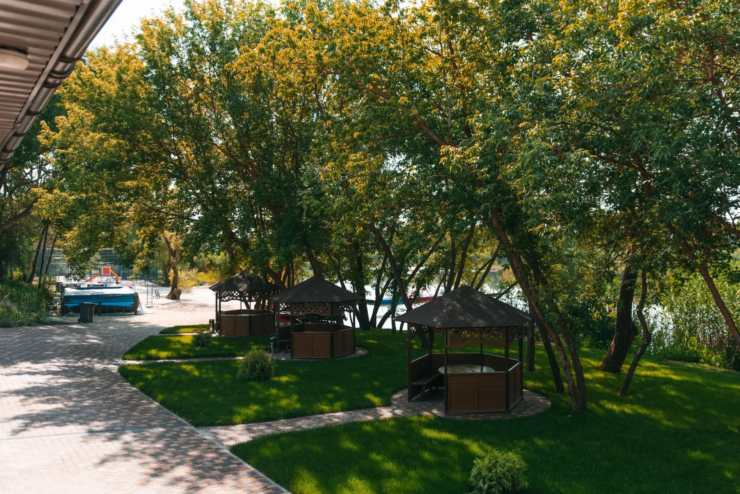Територія комплексу оточена хвойним лісом, де чисте повітря наповнює легені киснем, а затишні алеї надихають на неспішні прогулянки. Вдале поєднання тиші, води й зелені створює умови для повного перезавантаження.