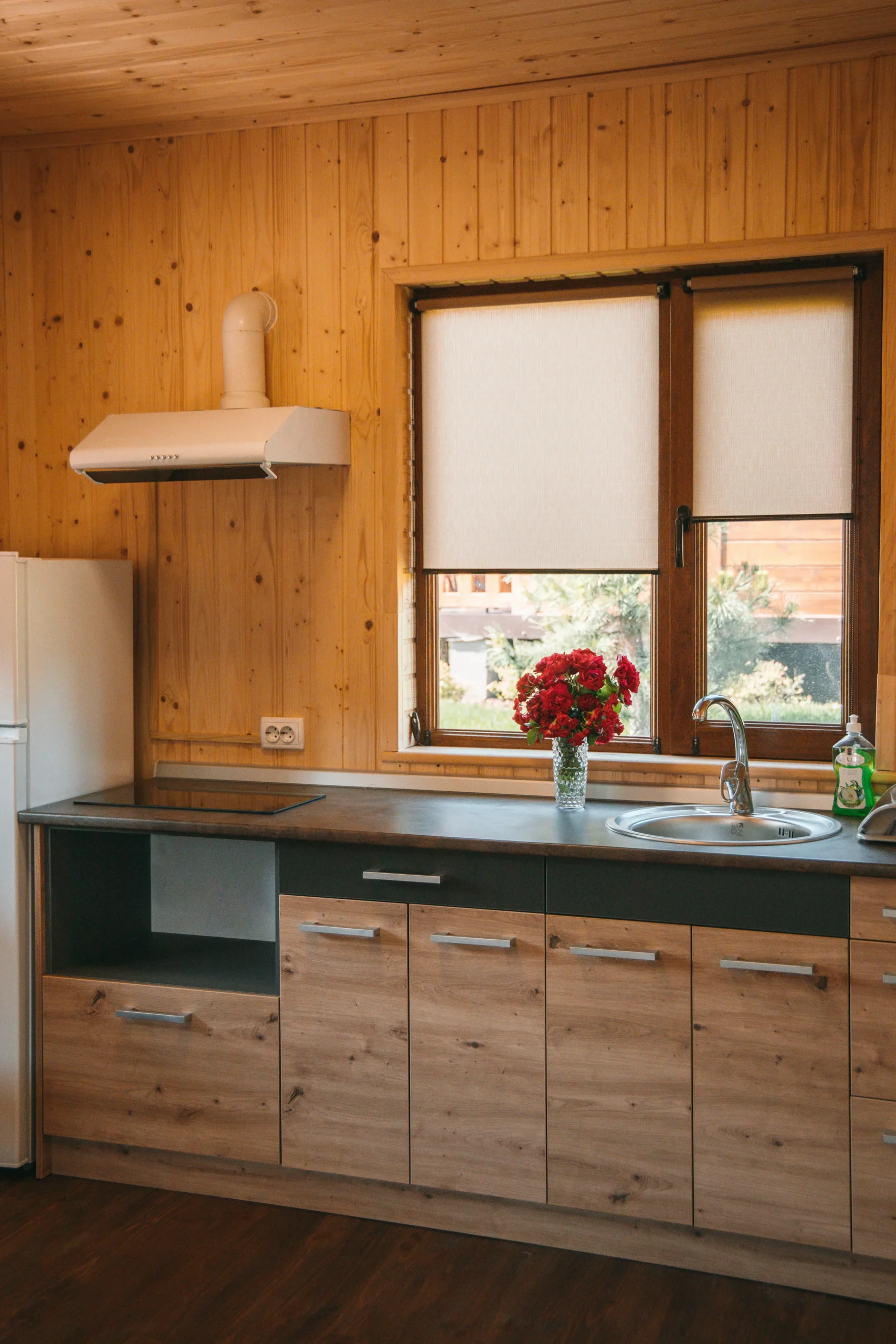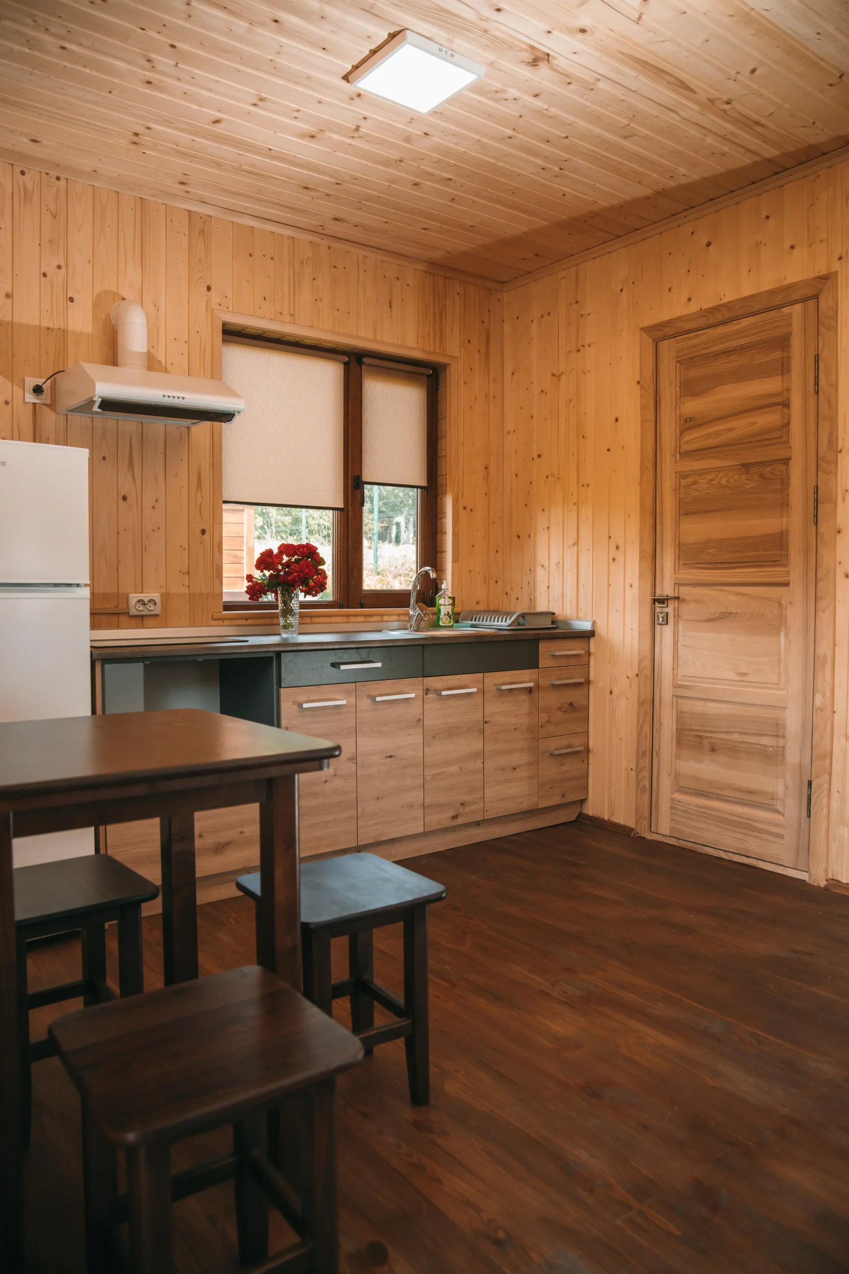 Однокімнатний будинок площею понад 30 м² розрахований на чотирьох осіб. Простір організовано так, щоб усім гостям було зручно. У будинку: